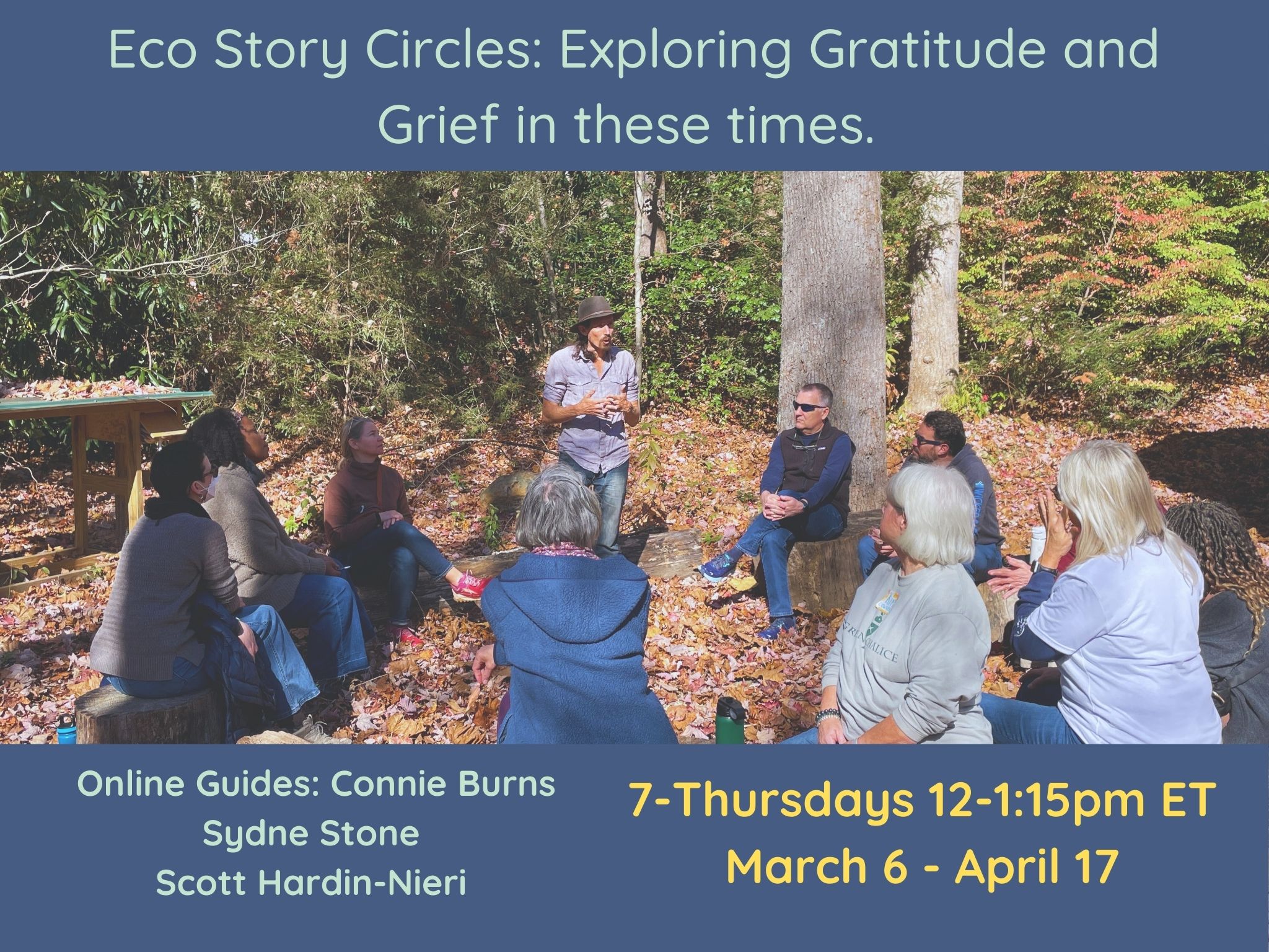 Eco Story Circle Series: Exploring Gratitude and Grief in These Times (formerly Eco Grief Circles). March 6 – April 17. 7 Thursdays 12-1:15 pm Eastern Time